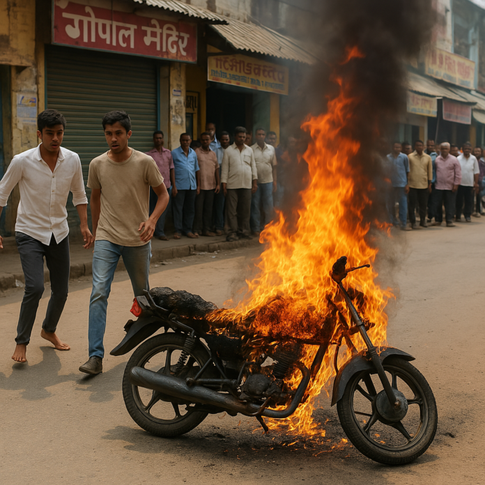 हथुआ बाजार में शुक्रवार की सुबह 11:30 के करीब उस समय अफरा-तफरी मच गई जब एक चलती बाइक में अचानक आग लग गई। इस हादसे में बाइक सवार दोनों युवक समय रहते कूदकर बाल-बाल बच गए, लेकिन बाइक पूरी तरह जलकर खाक हो गई।प्रत्यक्षदर्शियों के अनुसार, यह घटना हथुआ बाजार के गोपाल मंदिर गेट के समीप हुई। इस घटना के दौरान ही अग्निशमन विभाग को सूचित किया गया, लेकिन दमकल की गाड़ी आग बुझ जाने के आधे घंटे बाद मौके पर पहुंची। स्थानीय लोगों की तत्परता से आग पर काबू पा लिया गया।बाइक सवार युवकों ने बताया कि वे हथुआ अस्पताल में इंजेक्शन लगवाने आए थे और वहां से अपने गांव, सिवान जिले के नौतन थाना क्षेत्र के हसुआ, लौट रहे थे। उसी दौरान बाइक में अचानक आग लग गई। दोनों युवक बाइक से कूदकर अपनी जान बचाने में सफल रहे। हालांकि आग लगने के कारणों की पुष्टि नहीं हो सकी है, लेकिन युवकों का अनुमान है कि बाइक की टंकी से तेल का रिसाव होने के चलते यह हादसा हुआ होगा।