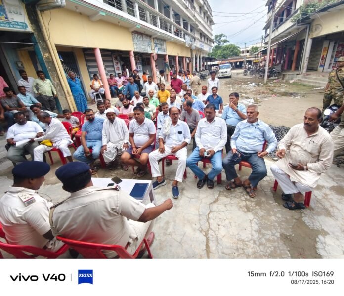 गोपालगंज। पुलिस अधीक्षक के निर्देश पर महाबीरी अखाड़ा और बाजार की सुरक्षा व्यवस्था को लेकर विशंभरपुर थाना परिसर में नई तैनात थानाध्यक्ष मुकेंद्र कुमार ने सिपाया ढ़ाला बाजार के व्यवसायियों व दुकानदारों के साथ बैठक की।