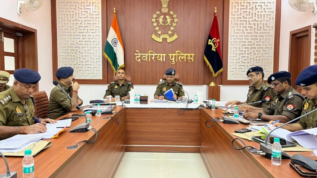 देवरिया। पुलिस लाइन सभागार में मंगलवार को पुलिस उप महानिरीक्षक, गोरखपुर परिक्षेत्र श्री एस. चन्नप्पा की अध्यक्षता और पुलिस अधीक्षक देवरिया श्री संजीव सुमन की उपस्थिति में अपराध गोष्ठी का आयोजन किया गया। इस बैठक का उद्देश्य जिले में अपराध पर प्रभावी नियंत्रण, कानून-व्यवस्था को सुदृढ़ बनाना और आगामी त्यौहारों को शांति एवं सुरक्षा के साथ सम्पन्न कराना था।