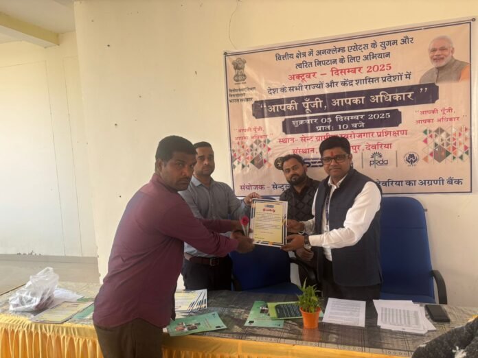 देवरिया। भारत सरकार के वित्त मंत्रालय द्वारा निर्देशित एवं अक्टूबर से दिसंबर 2025 तक चलाए जा रहे जन-जागरूकता अभियान के तहत शुक्रवार को सेण्ट ग्रामीण स्वरोजगार प्रशिक्षण संस्थान परिसर में “आपकी पूँजी, आपका अधिकार” शिविर आयोजित किया गया। शिविर में भारतीय रिज़र्व बैंक के अंकुश श्रीवास्तव, अग्रणी बैंक कार्यालय से आशीष मीणा, सेंट्रल बैंक के वरिष्ठ प्रबंधक राकेश कुमार, पंजाब नेशनल बैंक के कुलदीप कुमार शाह तथा भारतीय स्टेट बैंक राघवनगर के मनीष कुमार सहित विभिन्न बैंकों एवं वित्तीय संस्थानों के अधिकारी उपस्थित रहे।