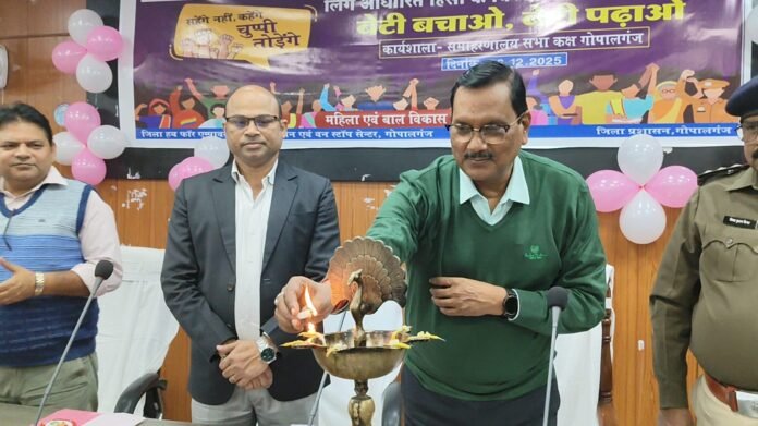 गोपालगंज। समाहरणालय सभा कक्ष में जिला प्रशासन एवं महिला एवं बाल विकास निदेशालय के संयुक्त तत्वावधान में लिंग आधारित हिंसा के विरुद्ध जिला स्तरीय कार्यशाला का आयोजन किया गया। कार्यक्रम की शुरुआत मुख्य अतिथि जिला पदाधिकारी पवन कुमार सिन्हा द्वारा दीप प्रज्वलित कर की गई। इस अवसर पर भू-अर्जन पदाधिकारी अनिल कुमार, पंचायती राज पदाधिकारी धर्मेंद्र कुमार, वरीय कोषागार पदाधिकारी शशिकांत आर्या, आईसीडीएस जिला कार्यक्रम पदाधिकारी सहित अन्य विभागों के पदाधिकारी एवं प्रशिक्षार्थी उपस्थित रहे।