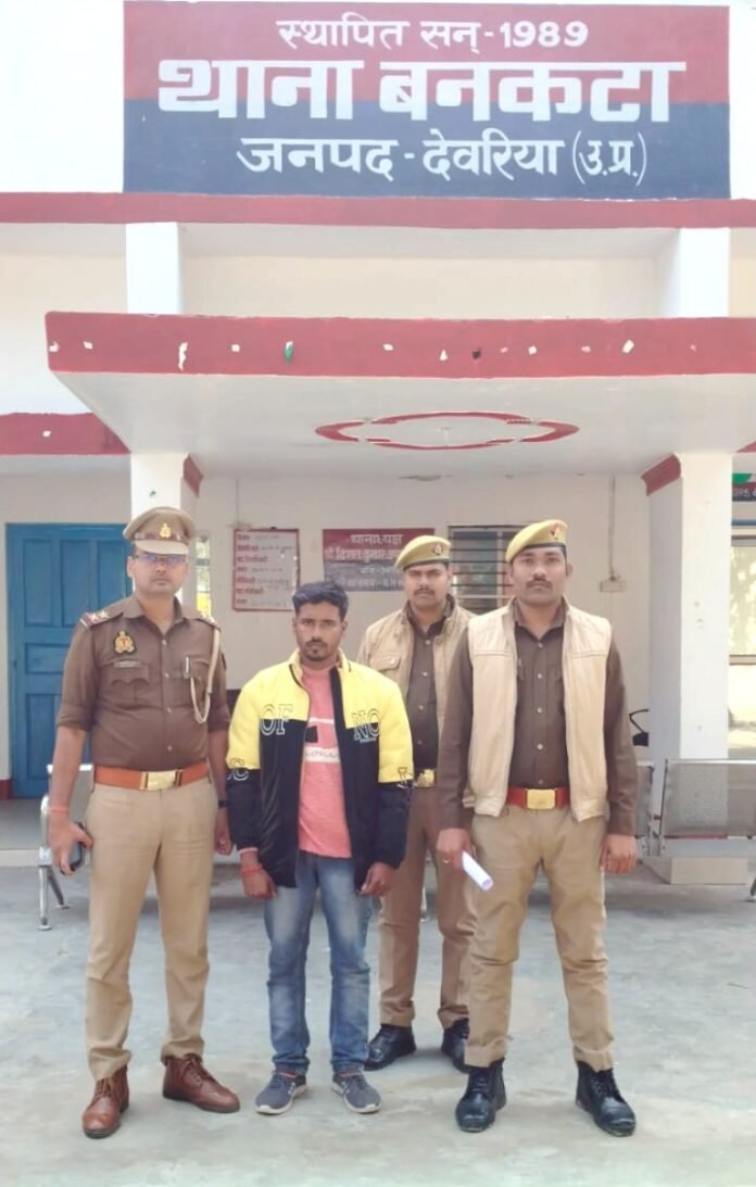 देवरिया। थाना बनकटा पुलिस ने दुष्कर्म और आईटी एक्ट के मामले में अभियुक्त नितेश पासवान (थानाक्षेत्र बनकटा) को मुखबिर की सूचना पर इंगुरी सराय ढाला के पास से गिरफ्तार किया है।